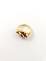 Bague de petit doigt en or 750 mil à décor floral sertie de 3 diamants TA en serti clos (le central : 0,65 ct environ) (TDD : 44) (diamant central cassé, manque de matière, égrisures, usures). 7 g brut.
