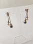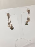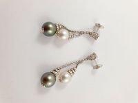 En parure avec le n° 166 : paire de pendants d’oreilles MOUAWAD en or gris 750 mil à motifs de spirales serties de diamants brillantés et de perles de culture grises et blanches (diamètres des perles : 9 à 10,4 mm environ, longueur : 5 cm) (pierre manquante) (systèmes Alpa). Signés. 11,4 g brut.