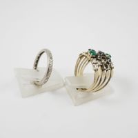 Deux bagues dont une multiple en or gris 750 mil. composée de 5 anneaux (diamants brillantés, saphirs, émeraude, pierres imitation incolore et verte (TDD : 54) (manque pierres, égrisures) et d’une alliance US en platine 950 mil. et or rhodié 750 mil. (diamants 8/8) (trace de mise à grandeur en or, pierres cassées, manque pierre) (TDD : 51). 8,5 g. brut