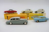 DINKY TOYS France et DINKY TOYS Spain – MECCANO, lot de 5 miniatures, dans leurs boîtes : -Volkswagen Karmann - Ghia, avec glaces, couleur rouge et noire, devant bombé. Réf. 24M. - Citroën DS19, couleur ivoire, toit aubergine. Réf. 24C. - Rolls-Royce Silver Wraith, avec suspension, glaces et chrome, couleur gris et gris foncé. Réf. 551. - Simca 1000, avec direction, suspension, aménagements intérieures et glaces, couleur bleue. Réf. 519. - Citroën Dyane, avec capot et hayon ouvrant, moteur décoré, plancher moulé, plaques minéralogiques, suspension, aménagements intérieurs et glaces, couleur grège. Réf. 1413. (Usures).
