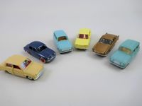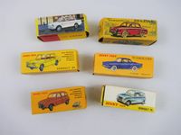 DINKY TOYS France et DINKY TOYS Spain – MECCANO, lot de 5 miniatures, dans leurs boîtes : - Renault 4L, avec direction, suspension, aménagements intérieurs et glaces, couleur bleu gris. Réf. 518. - Renault R8, avec direction, suspension, aménagements intérieurs et glaces, couleur jaune. Réf. 517. - Daf, avec portes ouvrantes, dossiers rabattables, phares et feux rouges scintillants, plancher moulé, conductrice, suspension, aménagements intérieurs et glaces, couleur beige. Réf. 508. - Renault « Floride », avec suspension et glaces, couleur bronze métallisé. Réf. 543. - Renault 4L, avec suspension, aménagements intérieurs et glaces, couleur bleu gris. Réf. 518. On y joint une miniature : CIJ France – Renault « Dauphine », couleur bleue. Réf. 3/56. Dans sa boîte. (Usures).
