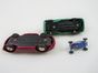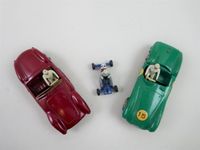 DINKY TOYS France - MECCANO, lot de 3 miniatures, dans leurs boîtes : - Maserati Sport 2000, couleur rouge, jantes convexes. Réf. 22A. - Aston Martin « D B 3 Sport », couleur verte, n°15. Réf. 506. - Leskokart Midjet, avec pilote bleu, couleur bleue. Réf. 512. (Usures).
