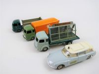DINKY TOYS France – MECCANO, lot de 4 miniatures, dans leurs boîtes : - Citroën Ambulance « ID19 », Super détail avec direction, suspension, aménagements intérieurs, glaces, auvent et hayon ouvrants, couleur grise et blanc. Réf. 556. - Fourgon Simca « Cargo », couleur vert olive et jaune orangé. Réf. 33A. - Benne basculante Simca « Cargo », couleur vert foncé et gris, benne lisse. Réf. 33B. - Miroitier Simca « Cargo », couleur gris, plateau vert foncé, chevalet marqué « Miroitier » et « Saint-Gobain ». Réf. 33C. (Usures).