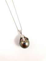 Pendentif en or gris 750 mil retenant une perle de culture grise de forme poire (diamètre : 16,2 mm environ), la bélière et les griffes serties de diamants brillantés, sur collier en or gris 750 mil (longueur : 45,5 cm, hauteur du pendentif : 3 cm environ). 14,1 g brut.
