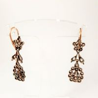 Bague Marquise 2 ors 750 mil. sertie de roses (pierres cassées) (Longueur de la navette : 2,7 cm) (TDD : 54,5). Paire de pendants d’oreilles en or 375 mil. et métal sertis de roses (exemptés art. 524 bis al. c du CGI) ( pierres cassées, égrisures) (hauteur : 5 cm). 12 g. brut.