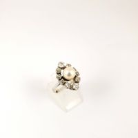 Bague Marquise en or gris 750 mil. et platine 950 mil. centrée d’une perle de culture dans un entourage de diamants TA. (entre 0,10 et 0,20 carat). (Egrisures, petits manques de matière, élément de mise à grandeur à l’intérieur). (Longueur du plateau : 2,1 cm). (TDD : 54). 6,6 g. brut.