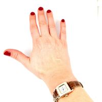 Montre bracelet de dame OBREY en argent 800 mil., petit boîtier carré agrémenté d’une breloque serrure, cadran blanc à index en chiffres arabes, mouvement à quartz, sur bracelet en cuir avec boucle ardillon. (Dimensions du boîtier : 2 cm ; longueur du bracelet : 18 cm).(Petites rayures et chocs d’usage). 31,4 g. brut.