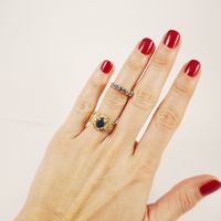Deux bagues en or 750 mil. dont une ornée d’un saphir ovale de 1,80 carat environ sur un pavage de diamants brillantés (TDD : 54) ; et une rivière sertie de six saphirs ronds (TDD : 51) (un petit éclat). 8,8 g. brut