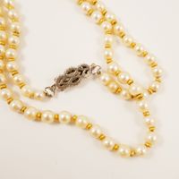 Long collier de perles de culture alternées de viroles en or 750 mil., fermoir en or gris 750 mil. réhaussé de petits rubis (longueur : 68 cm environ) (diamètres perles : entre 6,5 et 6,8 mm) (éclats) ; et paire de boutons d’oreilles en or 750 mil. orné chacun d’une perle de culture (diamètre perles : 6,4 mm) (systèmes ALPA). 40,4 g. brut