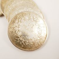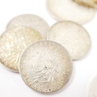 Lot de dix-sept pièces en argent dont une de 100 FRF, cinq de 50 FRF et sept de 10 FRF en argent 900 mil., et quatre de 5 FRF en argent 835 mil. (usures). 387,4 g.