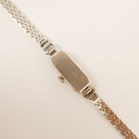 Montre-bracelet de dame en platine 950 mil., petit boîtier rectangulaire, lunette à décor géométrique sertie de diamants 8/8, cadran crème à chiffres arabes peints, mouvement mécanique, bracelet et boucle en métal (dimensions : 29 x 10 mm) (longueur : 15,5 cm environ) (usures, boucle défectueuse). 17,1 g. brut