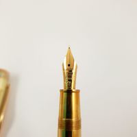 E) (art 524 bis du CGI, al c) : Stylo-plume OMAS « Trip of Phoenix » en résine et métal doré, à décor en émail polychrome d’un phœnix sur le corps, et du Parthénon en doré sur le capuchon. Le capuchon rehaussé d’un cabochon de pierre décorative verte. (Plume en or 750 mil.), (Système à piston). Édition limitée Jeux Olympiques de Pékin, numéroté n°056/888, signé. Avec housse.