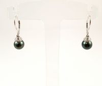 Paire de pendants d’oreilles en or gris 750 mil. retenant des perles de culture grises rehaussées de diamants brillantés. (Diamètres perles : 8,3 mm environ). (Hauteur : 2,5 cm). 3,6 g. brut