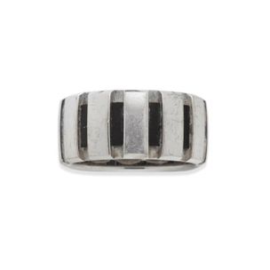 200 / 300 €CHAUMET, modèle « Class One ». Bague bandeau en or gris 750 millièmes ajouré et caoutchouc noir. (Usures). Signée et numérotée. Tour de doigt : 52/53. Poids brut : 8,3 g