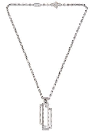 800 / 1 500 €Collier articulé en or gris 750 millièmes, les maillons ovales retenant un pendentif en or gris 750 millièmes à décor géométrique entièrement serti de diamants ronds de taille brillant. Signé Edouard NAHUM pour le collier. Longueur : 54,5 cm. Poids brut : 31,3 g