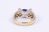 Bague en or gris 750 millièmes ornée au centre d'un saphir ovale entre des lignes de diamants ronds de taille brillant et saphirs calibrés. (Égrisures). Tour de doigt : 56 ½. Poids brut : 11,1 g