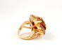 Bague en or jaune 750 millièmes figurant une fleur, le centre orné d'un diamant rond de taille brillant, les pétales pavés de rubis et pierres rouges et noires. (Intérieur de l'anneau gravé de l'inscription "Ti Amo"). Tour de doigt : 56. Poids brut : 23,7 g