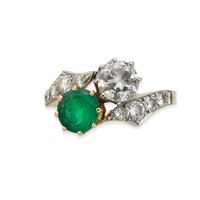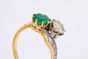 Bague « Toi et Moi » en or jaune 750 millièmes ornée au centre d'une émeraude et d'un diamant rond de taille brillant entre deux lignes de diamants également ronds de taille brillant. (Égrisures). Tour de doigt : 53 ½. Poids brut : 3,6 g. Poids approximatif calculé du diamant : 0,60/0,70 ct