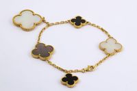 VAN CLEEF & ARPELS, modèle « Magic Alhambra ». Bracelet articulé en or jaune 750 millièmes décoré de cinq motifs quadrilobés, orné au centre d'onyx, nacre blanche et grise, un plus important en pampille.Signé et numéroté. Longueur : 19,5 cm. Poids brut : 18,0 g