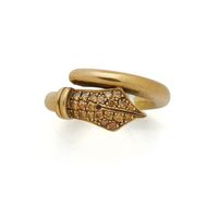YURI KUPER. Bague en or jaune 750 millièmes à décor d'émaillement, l'extrémité figurant une plume de stylo pavée de diamants ronds de taille brillant et de couleur fantaisie brun orangé. (Les diamants de couleur n'ont pas été testés pour l'origine de leur couleur naturelle). Signée et numérotée. Tour de doigt : 53. Poids brut : 12,7 g