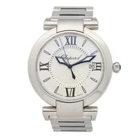 CHOPARD, Impériale. Montre d’homme ronde (diamètre : 36 mm) en acier. Boîtier fond fermeture à vis. Cadran argenté avec centre stylisé, index et aiguilles luminescents, trotteuse centrale et date à guichet, minuterie chemin de fer. Mouvement quartz. Référence : 8532. No. de série : 1605261. Bracelet en acier avec fermoir à double déployant signé. Poignet : 15,5 cm. Sans écrin ni papiers.