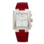 CHRISTIAN DIOR Montre de dame rectangulaire (31,5 x 33 mm) en acier et diamants avec chronographe. Boîtier lisse serti de brillants. Boîtier fond fermeture à vis. Cadran blanc avec index bâtons et chiffres arabes, trois compteurs pour le chronographe, minuterie chemin de fer et date à guichet. Mouvement quartz. Référence : D81 - 101. No. de série : DZ 8007. Bracelet en cuir rouge. Fermoir double déployant signé. Sans écrin ni papiers.