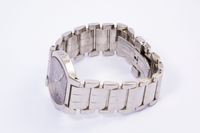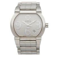 FRED Montre d’homme ovale (36,5 x 41 mm) en acier. Lunette lisse. Boîtier fond fermeture à vis. Cadran argenté avec chiffres arabes stylisés, trotteuse centrale et date à guichet. Mouvement quartz. Référence : CW 4843. No. de série : FD 014110. Bracelet en acier avec fermoir double déployant. Poignet : 19 cm. Sans écrin ni papiers."