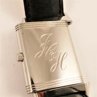 JAEGER LECOULTRE, Reverso. Montre de d’homme rectangulaire (23 x 38,5 mm) en acier. Boîtier réversible avec fond gravé d’initiales en lettres anglaises. Cadran argenté avec chiffres arabes et minuterie chemin de fer. Mouvement mécanique à remontage manuel. Référence : 250.8.86. No. de série : 1746411. Bracelet en cuir noir. Boucle ardillon en acier signée. Avec un écrin accidenté.