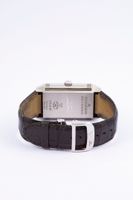 JAEGER LECOULTRE, Reverso Night & Day. Montre d’homme rectangulaire (30 x 49 mm) en acier. Boîtier réversible avec double cadran. Recto : argenté avec chiffres arabes, grande ouverture pour la date à guichet, petite trotteuse et minuterie chemin de fer. Verso : noir avec chiffres arabes, minuterie chemin de fer, aiguilles luminescentes, cadran excentré pour l’indication 24h, mode jour/nuit. Mouvement mécanique à remontage manuel. Bracelet en cuir noir. Fermoir déployant en acier signé. Référence : 273.8.85. No. de série : 2933830. Sans écrin ni papiers.
