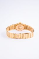 OMEGA, Constellation. Montre de dame ronde (diamètre : 23 mm) en or rose 750 millièmes et diamants. Lunette sertie de brillants. Boîtier fond fermeture à pression avec logo en relief. Cadran blanc sur fond siglé du logo de la marque avec index brillants. Mouvement quartz. Boîtier No. 59930703. Bracelet en or 750 millièmes avec fermoir déployant coulissant siglé. Poignet : 17,5 cm. Poids brut : 67,9 g. Sans écrin ni papiers.