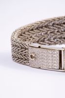 OMEGA, De Ville. Montre de dame ovale (22 x 20 mm) en or blanc 750 millièmes. Lunette stylisée motif « écorces ». Remontoir saphir cabochon. Boîtier fond fermeture à pression. Cadran argenté avec index bâtons appliqués. Mouvement mécanique à remontage manuel. Bracelet en or 750 millièmes stylisé avec fermoir siglé du logo en relief. Poignet : 17 cm. Poids brut : 48,7 g. Sans écrin ni papiers.