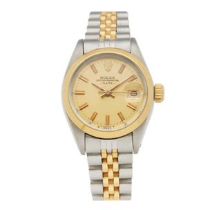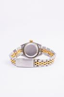 ROLEX, Datejust. Montre de dame ronde (diamètre : 26 mm) en acier et or. Lunette lisse en or 750 millièmes. Couronne et fond vissé. Cadran blanc avec chiffres romains, points et aiguilles luminescents, trotteuse centrale et date à guichet, minuterie chemin de fer. Mouvement mécanique à remontage automatique, certifié chronomètre. Référence : 69163. No. de série : R263511. Bracelet Jubilee en acier et or 750 millièmes avec fermoir déployant signé (468B L 10 62523D 18). Poignet : 17,5 cm. Poids brut. : 55,7 g. Sans écrin ni papiers. E) (art.524 bis du CGI, al. C)