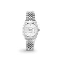 ROLEX, Datejust. Montre d'homme ronde (diamètre : 36 mm) en acier. Lunette striée. Fond vissé. Cadran argenté index bâtons en applique. Mouvement mécanique à remontage automatique, trotteuse centrale, datographe guichet à 3h. Bracelet « Jubilé ». Fermoir dépliant acier (62510H/L12). Référence : 16030. N° de série : R593541 (Circa 1987/88). Poignet : 19,7 cm. Écrin, papiers.