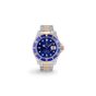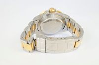 ROLEX, Submariner. Montre d'homme ronde (diamètre : 40 mm) en or jaune 750 millièmes et acier. Lunette tournante à cliquet, unidirectionnelle bleue. Fond vissé. Cadran bleu, index et plots ronds cerclés en applique. Mouvement mécanique à remontage automatique, trotteuse centrale, datographe guichet à 3h . Bracelet « Oyster » (93153/401B) or jaune 750 millièmes et acier. Fermoir « OysterLock » (93153-18/V12). Référence : 16613. N° de série : T673836 (Circa 1996/97). Poids brut : 132,8 g. Poignet maximum : 16,2 cm. E) (art. 524 bis du CGI, al. c). Ecrin et carte garantie internationale de service pour une révision du 3/04/2014.