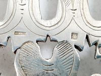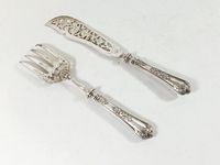 ARMAND FRENAIS, Fin XIXe siècle : Couvert à servir le poisson, le manche piriforme en argent 950 mil. de style transition à filets et volutes de feuilles de céleri. Les hauts en métal argenté ajouré à décor de joncs et feuilles de vigne. Poinçon de fabricant pour le métal argenté (actif 1877-1927). Sur les manches : Ancienne Minerve 1er titre. Poids brut total : 361.5 g. légères déformations. Non Chiffrés. H. 28.6 et 32 cm.