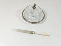 AUGUSTE FLINOIS, vers 1910 : Confiturier en cristal gravé à frise de lauriers, les montures à filets rubanés et graine pomme de pin en argent 950 mil. Ancienne Minerve 1er titre et poinçon de Maître AF bicyclette (actif 1898-1924). Poids brut : 453.8 g. Diam. De la soucoupe : 15 cm. H. total : 10 cm. Micro-rayures et très petites égrisures à l’intérieur du col. TBE. + 1 petit couteau à fruit lame argent 800 mil. de la fin du XIXe siècle. Ancienne Minerve 2e titre et manche en nacre à monogramme ABK. Nacre recollée près de la virole, rayures et usures d’usage. Poids brut : 46 g. L. 20.2 cm. Parfait pour couper et tartiner éventuellement ses scones !