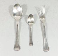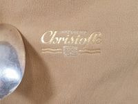 CHRISTOFLE, BOREAL, XXe siècle, Années 1930-1940 : ménagère de 38 pièces en métal argenté, la spatule palmiforme à gradins comprenant 12 grandes fourchettes, 12 grandes cuillers, 12 cuillers à café, 1 cuiller à ragoût et 1 louche. Signée. Poinçon OC période 1935-1983. Rayures d’usage. BE. Le modèle a été créé dans les années 1930 par le designer LUC LANEL (1893-1965). Ecrin Christofle avec le poinçon de Maître CC d'avant 1935.
