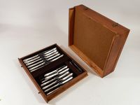 CHRISTOFLE, MARLY, fin du XXe siècle : ménagère rocaille en métal argenté de 62 pièces comprenant 12 grandes fourchettes, 12 grandes cuillers, 12 cuillers à café, 12 grands et 12 petits couteaux lames inox signées, 1 louche et 1 pince à sucre. Signée. Poinçons période 1935-1983. Production moderne. Dans son coffret CHRISTOFLE en bois, le tiroir des couteaux à recoller. TBE de la ménagère.