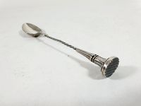 Cuiller à verre d’eau en argent 950 mil. de la fin du XIXe siècle, la tige torsadée, le culot à pilon et l’agrafe du cuilleron à feuillage. Ancienne Minerve de 1838 1er titre et poinçon de Maître non lisible. Poids : 25.1 g. Légères ususres. H. 19.3 cm. TBE.
