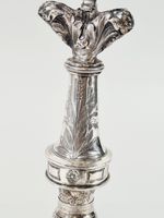 EPOQUE DIRECTOIRE : Croix d’autel en argent 950 mil. la base rectangulaire quadripode à décor en repoussé de gloire, nuées et feuillage en réserves avec écu non chiffré, fût balustre à ciselure de feuilles d’eau, joncs et pampres de vigne. La tête à cœur feuillagé et croix. Poinçons : Tête de sanglier vendémiaire Paris 1795-1797, 1er Coq 1er titre et garantie parisienne 1798-1809, Maître-Orfèvre indéterminé, Crabe pour les menus ouvrage de 1838. Poids : 285 g. H. 31.5 cm. Dim. base : 13.2 x 9.3 cm. 2 poinçons, le sanglier vendémiaire 1er titre 950 mil et la tête de cheval 2e titre 800 mil. ont été créés par le conseil des Cinq-Cents le 6 octobre 1795 qui décide d’exprimer les titres en millièmes.