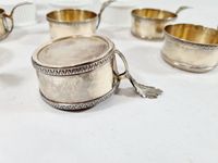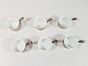 LAGRIFFOUL & LAVAL, vers 1910 : suite de 6 ramequins à soufflé en porcelaine blanche dans leur support en vermeil 950 mil. à frises de feuilles d’eau et prise latérale à appui-pouce en feuille d’acanthe, Ancienne Minerve 1er titre et poinçon de Maitre (actif 1899-1972). Petits éclats sur le col de 3 ramequins. Petite déformation sur un support. Poids net : 259.7 g. L. 10.2 cm. Diam. 6.5 cm. H. 3 cm au col. Et à la prise : 4.2 cm. Diam à la base d’un ramequin : 6 cm. TBE général de fraîcheur.