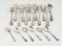 Lot en métal argenté de la fin du XIXe siècle, non chiffrés (rayures d’usage) : - 6 grandes fourchettes et 5 grandes cuillers baguette à médaillon perlé et feuillagé. Signées CHRISTOFLE, période 1862-1935. Non chiffrées. - 6 petites cuillers AU BON MARCHE à rocaille chantournée.- 1 grande cuiller à médaillon floral rubané (usures).