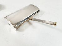 Lot en métal argenté et doré, travail étranger moderne :- Brosse ramasse-miettes mécanique, le manche à moulures de filets et bagues dorées. L. 17 cm. Dim : 15 x 7 cm. Légèrs rayures et piqûres. BE. La brosse est quasi-neuve. - Paire de beurriers rectangulaires couverts, les prises à gros gland, les doublures internes en verre. Légères rayures.
