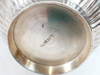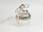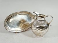 Lot en métal argenté, travail moderne du XXe siècle : - 1 pichet à godrons tournoyants et bec large sur une petite bâte, anse plate ondulée. Signé Silverfield. Travail moderne. H. 16.1 cm. Petites usures. TBE général. - 1 sucrier à côtes torses et fond plat, le fretel graine. Orfèvre OLRI. H. 12.5 cm. TBE- 1 Coupelle martelée en forme de bourse ouverte. SIS. LECUYER. H. 12.3 cm. TBE.-1 petit plateau ovale à moulures de filets. Rayures. Dim. 24.6 x 15 cm.