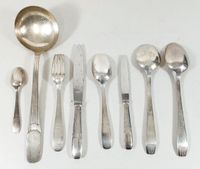 Ménagère des années 1930 de 54 pièces en métal argenté, modèle tonneau à gradins, la spatule à médaillon lisse, comprenant 12 grandes fourchettes, 12 grandes cuillers, 10 grands et 12 petits couteaux lames inox, 7 cuillers à café et 1 louche. Rayures et usures d’usage, importantes notamment sur les fourchettes, 1 manche de grand couteau à recoller. + 1 couvert à salade CHRISTOFLE tonneau à godrons de la même période en métal argenté. Non chiffré. Rayures.+ 1 pelle à tarte et 1 couteau à pâtisserie de N. COLLET des années 1940/50 en métal argenté, les manches à recoller.