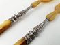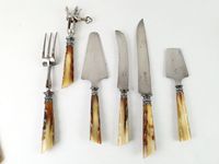Service de chasse de la fin du XIXe siècle à manches en corne comprenant dans son écrin à 2 plateaux :- 12 grands et 12 petits couteaux lames acier (Un petit couteau à lame raccourcie).- 8 pièces de service sur le plateau supérieur : 1 pelle à tarte, 1 couvert à découper, 1 manche à gigot, 1 couteau à pain et 1 pelle à pâté, 1 couvert à salade. - 1 couteau à beurre, 1 couteau à fromage, 4 pièces à hors d’œuvre les hauts en métal argenté de la maison GRANGE JEUNE (1 fourchette à saucisson, cuiller à olives, 1 petit couteau, 1 pelle à pâté). Les viroles feuillagées en argent 950 mil. exemptées art. 524 bis al. c du CGI sauf les viroles rocaille du couvert à salade poinçonnées à la tête de sanglier pour les menus ouvrages. Les lames signées LIMOUSIN ou LIMOUSIN FILS à CHATELLERAULT comme l’écrin d’origine.Poids total brut : 1852.2 g. TBE de fraicheur.