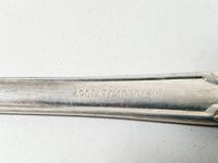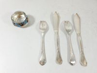 Suite de 12 fourchettes à poisson et 11 couteaux à poisson en métal argenté, modèle à spatule triangulaire et agrafes à petits rinceaux. Travail moderne étranger. Rayures. + 1 saleron de style Art Déco pan-russe émaillé et sa doublure verre. Travail moderne russe.