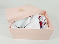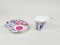 THE LEONARDO COLLECTION, GB, PRODUCTION CONTEMPORAINE : tasse tulipe allongée et sa sous-tasse ovale décentrée en porcelaine blanche à décor géométrique moderniste rose, bleu et noir. Cachet. Dans leur boîte rose. H. 9.8 cm. L. 14.2 cm. Diam. Sous-tasse : 16 cm.