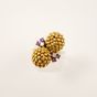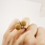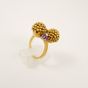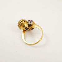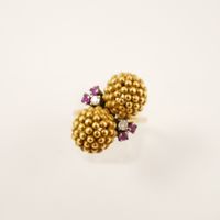 Bague « Toi et Moi » deux ors 750 mil. ornée de deux sphères à grainetis, épaulées de rubis et de diamant brillanté et 8/8 (TDD : 54) (petits éclats). 11 g. brut