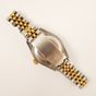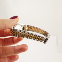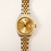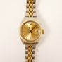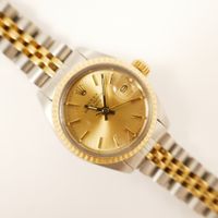 Bracelet-montre de dame ROLEX « Oyster Perpetual Date » en acier et or 750 mil., boîtier rond, lunette cannelée, cadran doré, index bâton appliqués, mouvement automatique, bracelet et boucle déployante en acier et or 750 mil., signé et numéroté (diamètre : 26 mm) (longueur : 17,5 cm environ) (bracelet distendu, verre rayé, usures). 53,5 g. brut